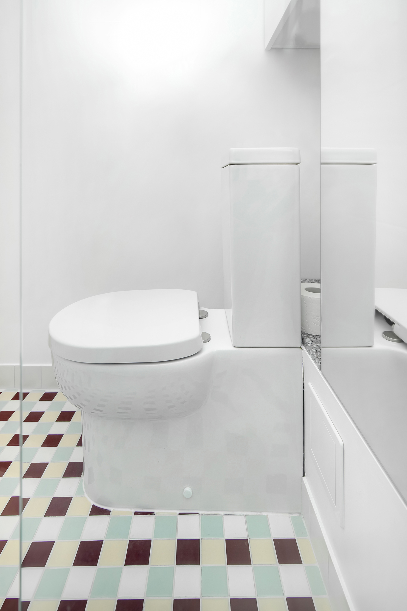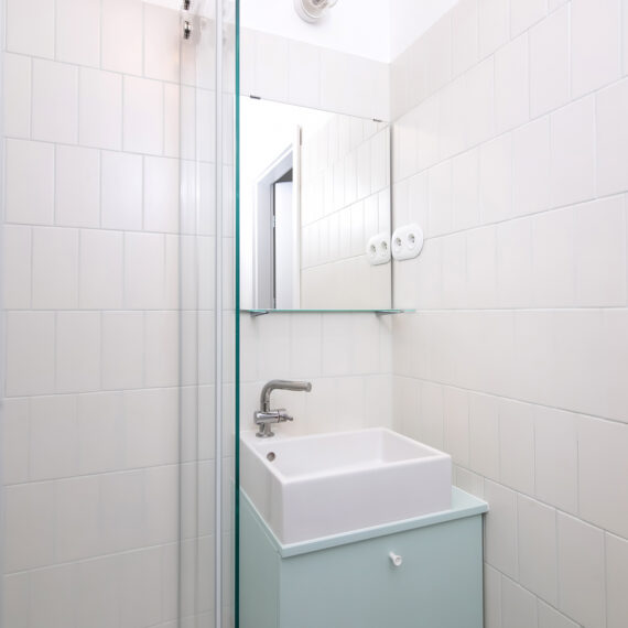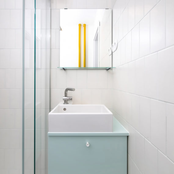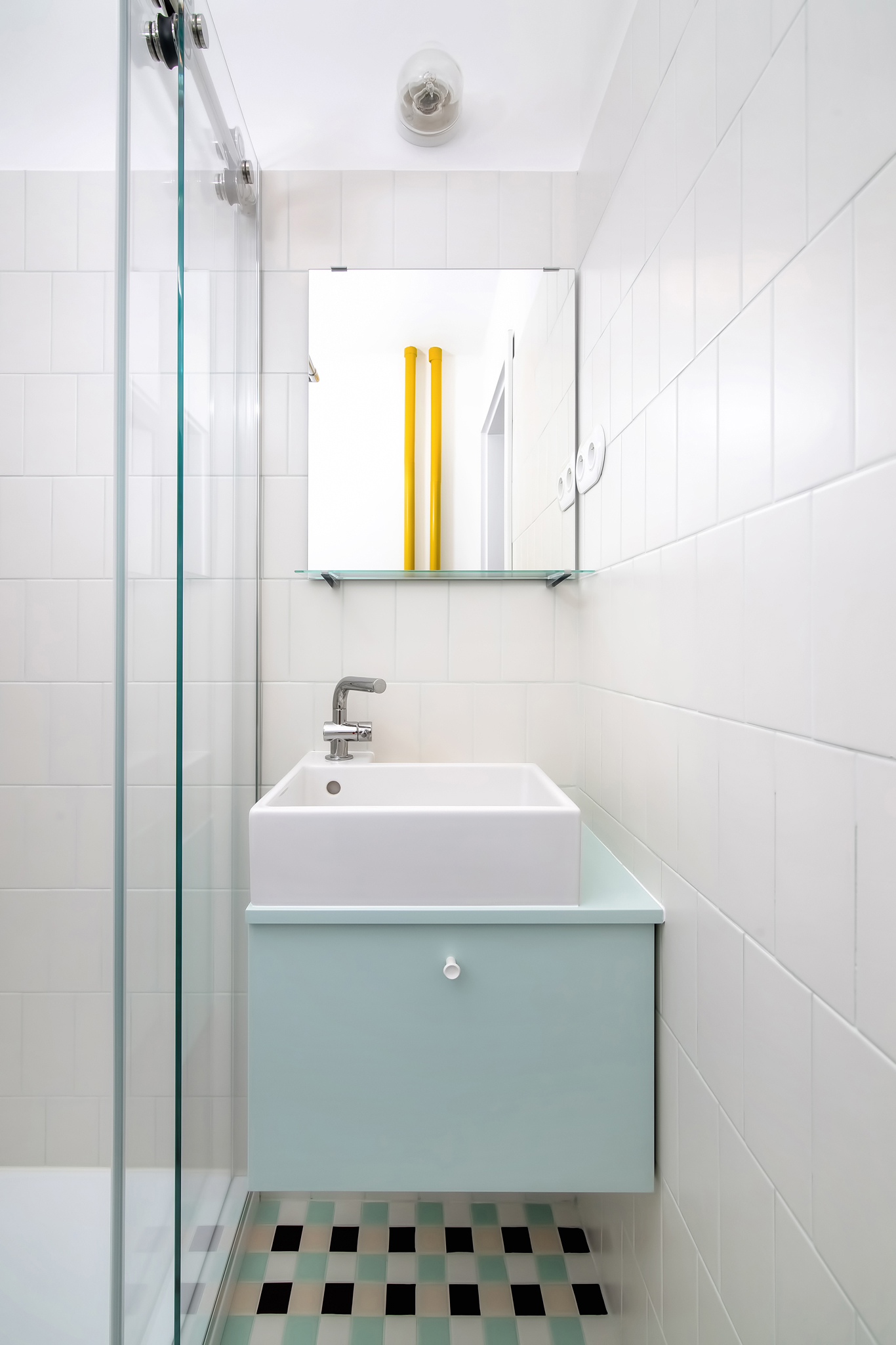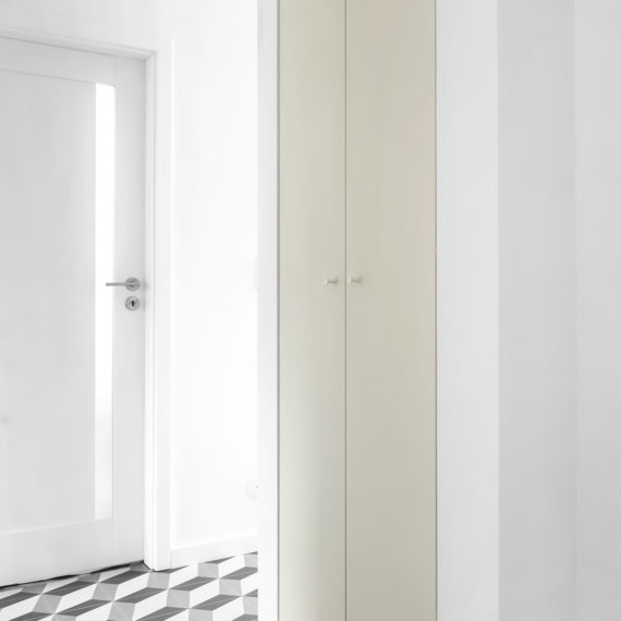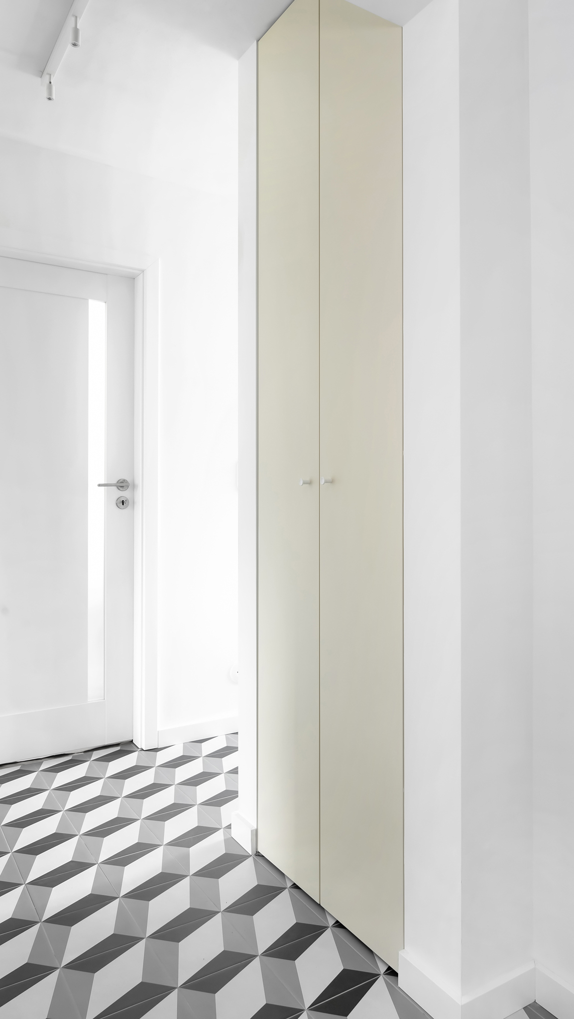 W designie wnętrz podtrzymano relację z architekturą budynku okresu lat 60-tych: w kuchni wprowadzono lastryko w kolorystyce bezpośrednio nawiązującej do oryginalnych parapetów, w łazience zachowano małe formaty płytek, które bezpośrednio korespondują z formatami i kolorystyką oryginalnych płytek balkonowych, na życzenie Inwestora wprowadzono awangardowe kontrasty zestawień kolorystycznych czerni i bieli, ochry i niebieskiego z szarością, czernią i odcieniami bieli, etc.